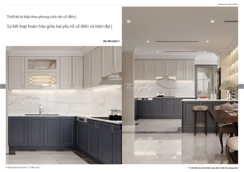 Kết hợp vẻ đẹp hiện đại và cổ điển, một ý tưởng thiết kế phòng bếp độc đáo là sử dụng một tủ bếp có 2 màu trên dưới đối lập nhưng lại hài hòa sang trọng.